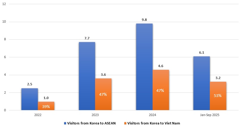 Within this overall recovery, Viet Nam stands out as the region’s most prominent destination. In 2023, Viet Nam welcomed 3.6 million Korean visitors, accounting for nearly 47% of total Korean arrivals to ASEAN. This figure rose to 4.6 million visitors in 2024, out of a regional total of 9.8 million. Notably, in just the first nine months of 2025, Viet Nam received 3.2 million Korean visitors, representing nearly 53% of all Korean arrivals to ASEAN during the same period.
